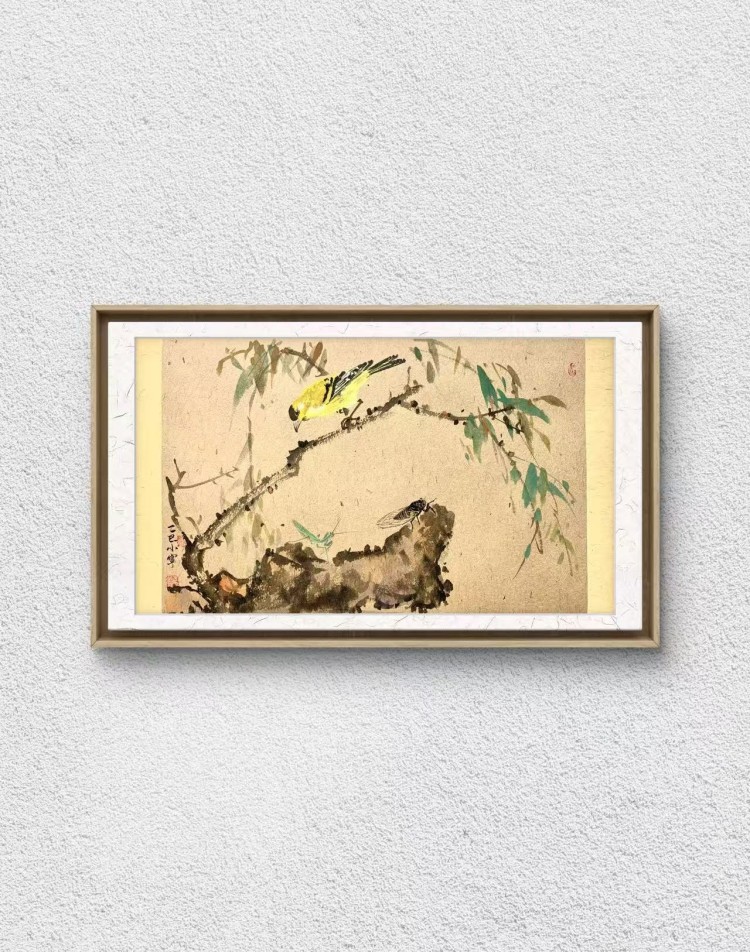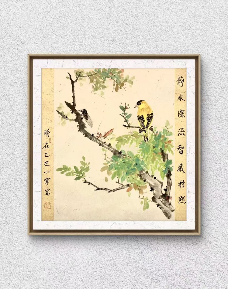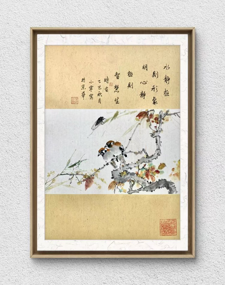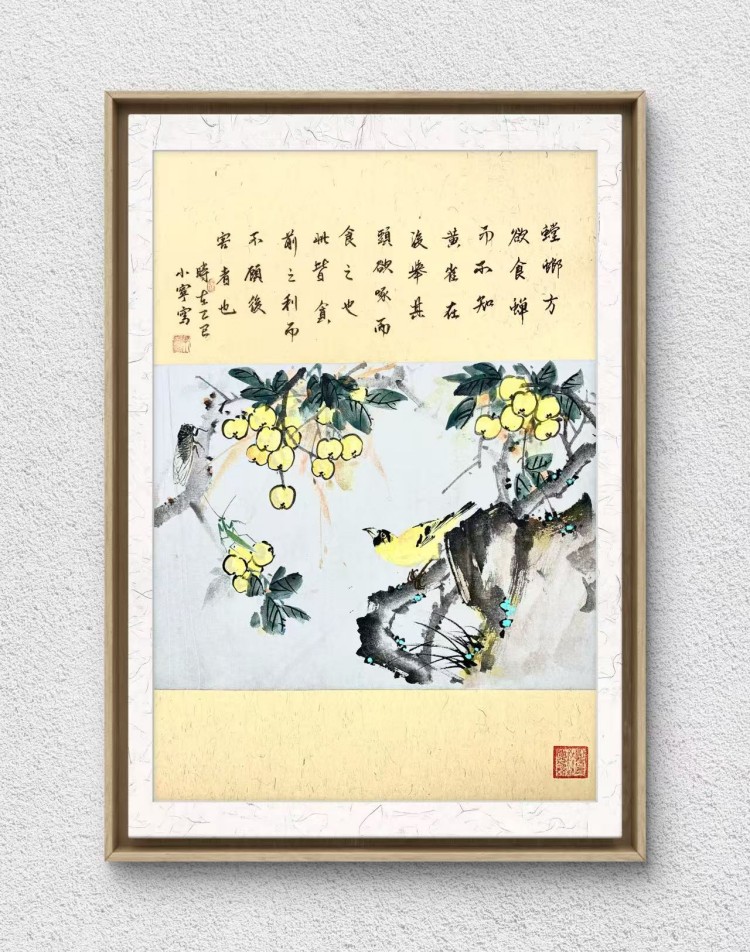 李小宁的作品不仅是技法的展示,更是对自然与人文的深刻思考。他的“螳螂捕蝉”系列,以草虫的微观世界隐喻人生百态,螳螂的凌厉与蝉的脆弱形成鲜明对比,暗含“物竞天择,适者生存”的哲理。而花卉草虫的和谐共生,则传递出“天人合一”的东方哲学。这种将自然观察与人文关怀结合的艺术语言,让他的作品超越了单纯的视觉美感,成为承载文化精神的载体。