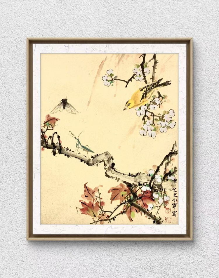 李小宁出身绘画世家,自幼浸淫于传统笔墨之中,对花鸟草虫的刻画有着近乎苛刻的追求。他潜心研习齐白石的写意神韵与王雪涛的灵动笔法,将工笔的细腻与写意的洒脱完美融合,形成了“以工写意,以意传神”的独特风格。其作品中的草虫,如螳螂捕蝉、蜻蜓点水,皆栩栩如生,仿佛能听见虫鸣与叶落的细微声响,展现出自然生命的律动。