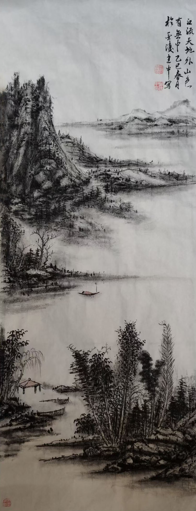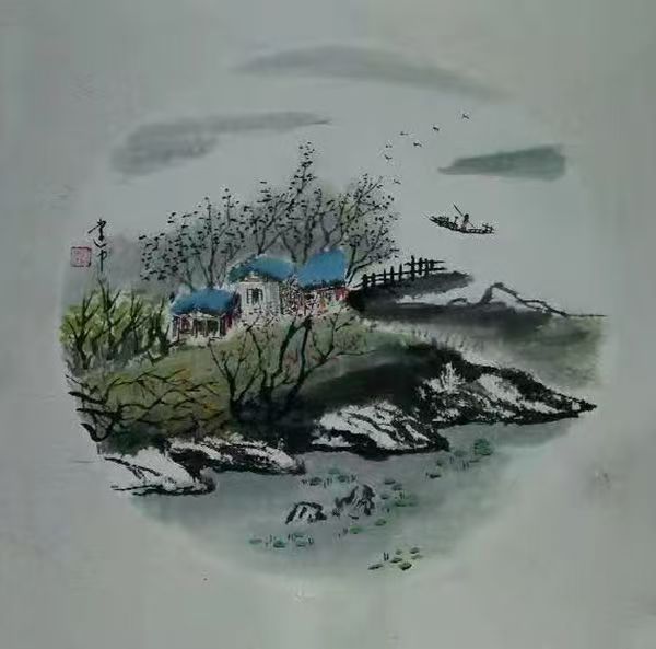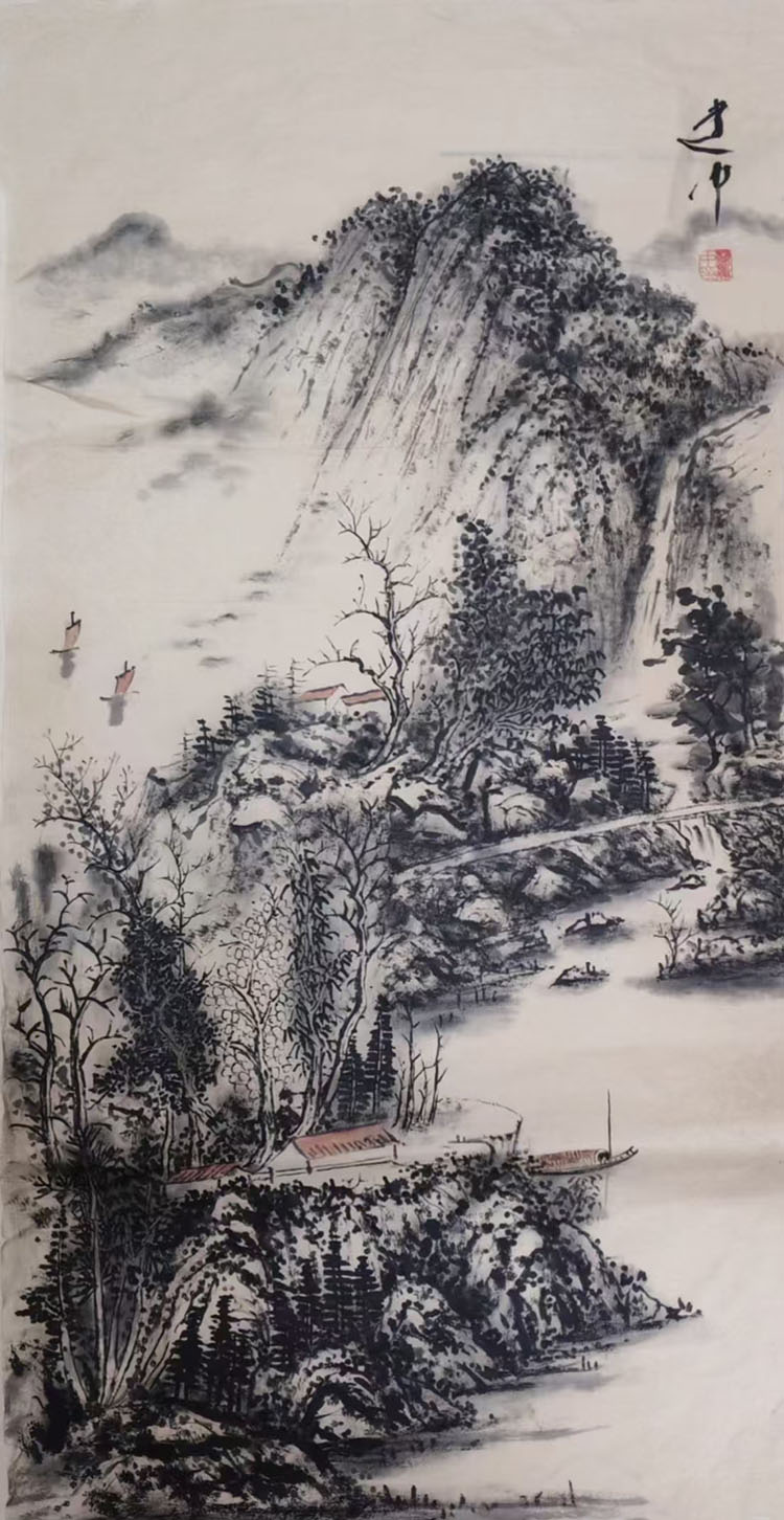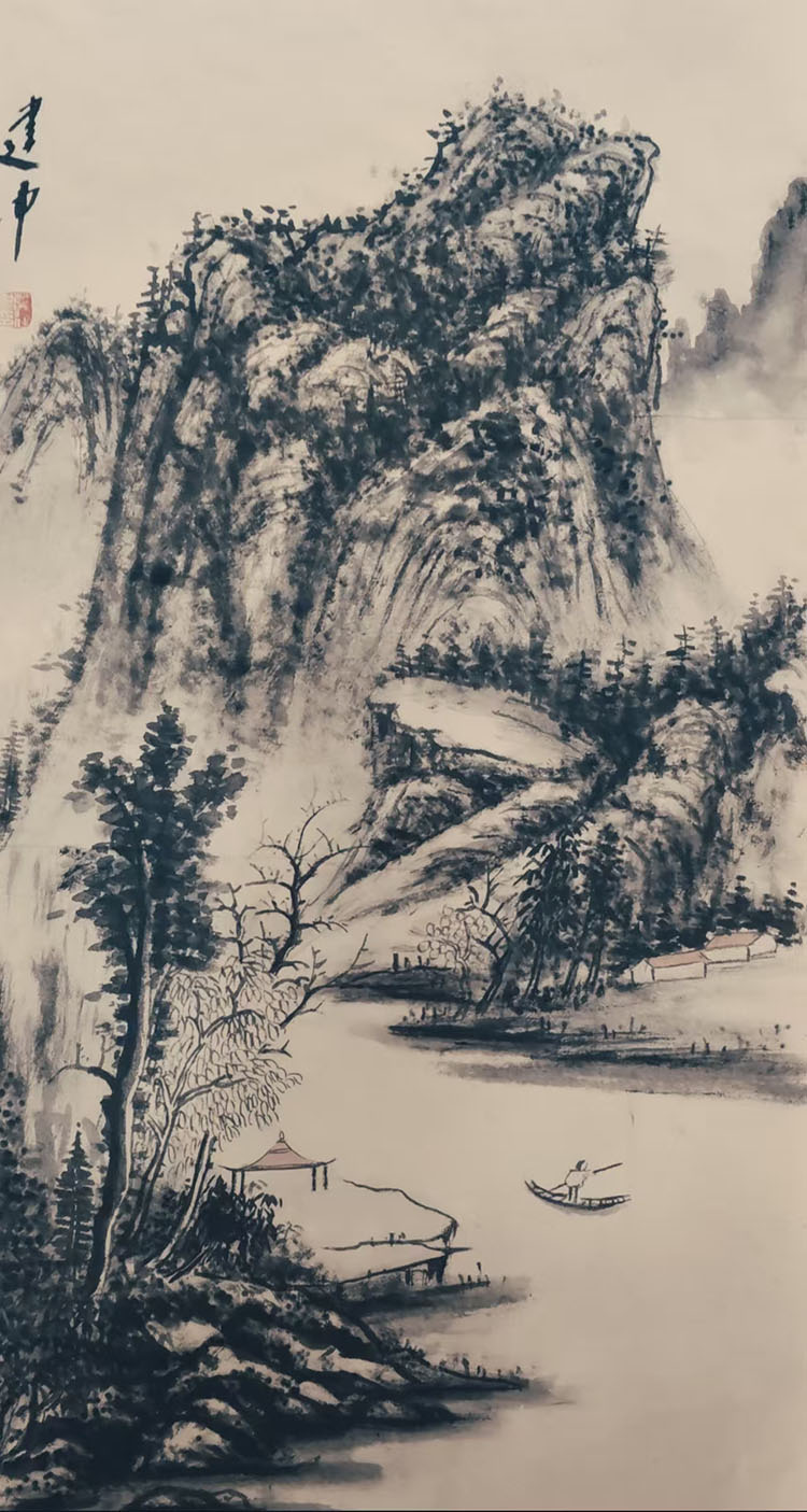 他擅于以水墨的浓淡干湿营造空间的虚实相生。远山如黛,近水含烟,扁舟一叶,独钓寒江——这是他笔下常见的意象。看似是古典题材的延续,实则是当代人精神归隐的渴望。他在宋元山水的苍茫浑厚与江南水乡的灵秀温润之间找到了完美的平衡点。