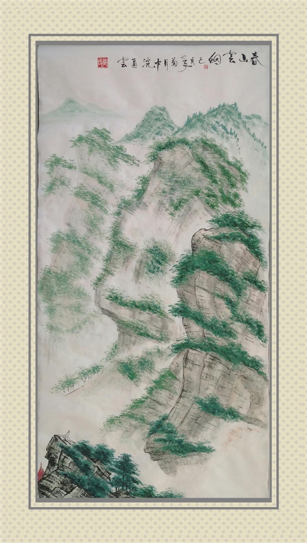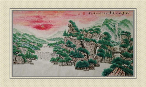 张通云山水用色,以青绿为尚,间衬小块绛色,以取万绿丛中一点红的悦目感。青山绿松,红日祥云果然悦目倾心,气蕴神祥。比如扇面山水《绿水青山总是情》一江静水,两岸青山,浅霞托红日,青绿相融,红绿顾映,把天地间的山水气蕴画满了,绘绝了。扇面成桥,夹山渡水,一派文化雅质,成为山水画中得气、归静、呈雅的艺术精品。挂而赏之可怡心,收而藏之可收益,艺术价值和拍藏