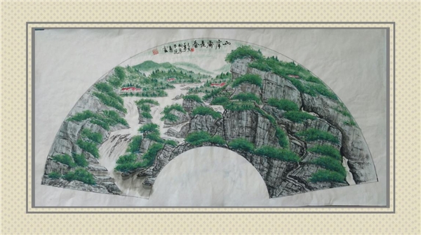 Zhang Tongyun's landscape is colored, with blue and green as the top, and small pieces of crimson color are lined between them, so as to take a little bit of red among the thousands of green trees. Green mountains, green pines, and auspicious clouds in the red sun are pleasing to the eye, and the spirit is auspicious. For example, the sector landscape "Green Water and Green Mountain Always Love" is a river with still water, green mountains on both sides, shallow chardonnay supporting red sun, green and green blending, and red and green reflecting, which makes the landscape between heaven and earth full and perfect. The fan forms a bridge, the mountains cross the water, and the culture is elegant, which has become a fine art in landscape painting. It is pleasant to hang and enjoy, profitable to collect and collect, artistic value and collection
