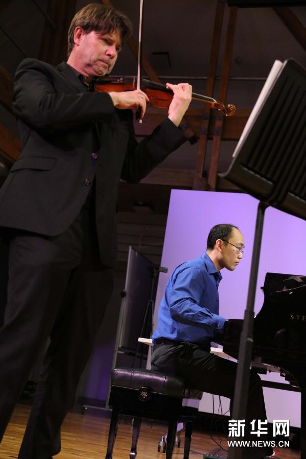 11月26日,在新西兰首都惠灵顿,新西兰音乐学院教授刘健(右)在音乐会上弹奏钢琴。(孟韬 摄)
